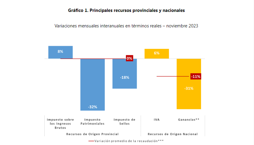 Entre los recursos de origen provincial, Ingresos Brutos, que explica el 83% de la recaudación propia, aumentó 175% interanual en términos nominales, lo que implica un crecimiento del 8% en términos reales para igual periodo. Sellos, que tiene una participación del 8% en la recaudación propia, muestra una variación negativa del 18% en términos reales respecto de noviembre de 2022.