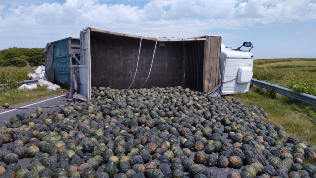 Al arribar las unidades y personal uniformado se constató, por causas que se tratan de establecer, el vuelco en solitario de un camión, cargado con zapallos y calabazas.