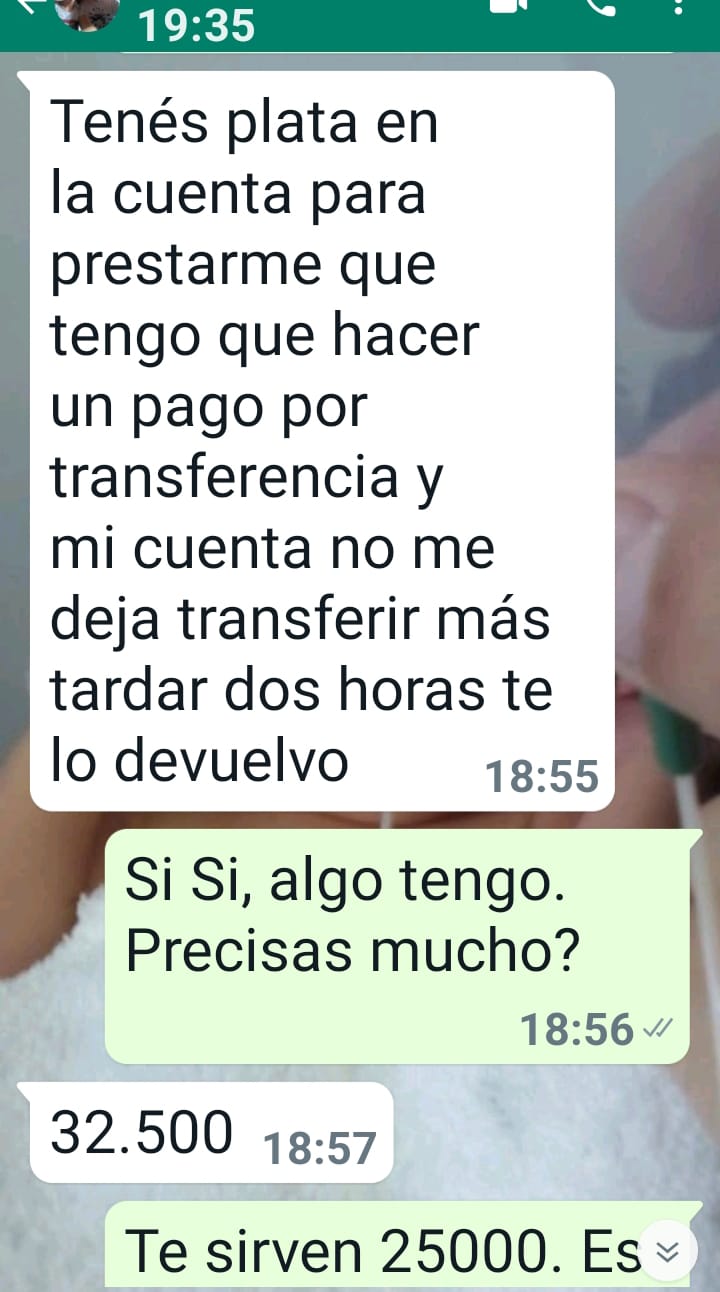 Uno de sus contactos le siguió la corriente al o los estafadores y consiguió que le pasaran un “alias” para hacer una transferencia. Le pedían $32.500 con compromiso de devolución en dos horas. El alias es: “Tavendano3.ppay” y la cuenta estaría a nombre de Emanuel Avendano.