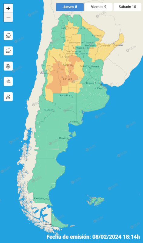 El área será afectada por tormentas, algunas localmente fuertes. Las mismas podrán estar acompañadas por abundante caída de agua en cortos períodos, fuerte actividad eléctrica, ocasional caída de granizo y ráfagas intensas. Se estiman valores de precipitación acumulada entre 30 y 50 mm, pudiendo ser superados en forma puntual.
