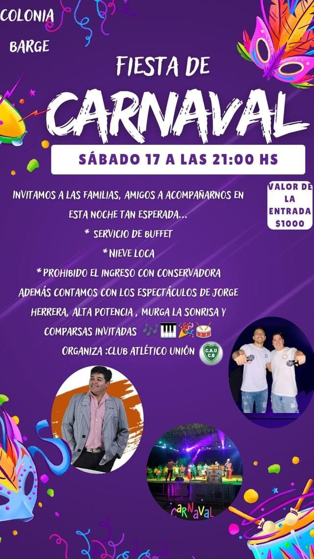 Este sábado 17 de febrero, se celebrará una noche de Carnaval en la vecina localidad de Colonia Barge. La invitación es para las 21:00 hs. y la entrada tiene un valor de $1.000.