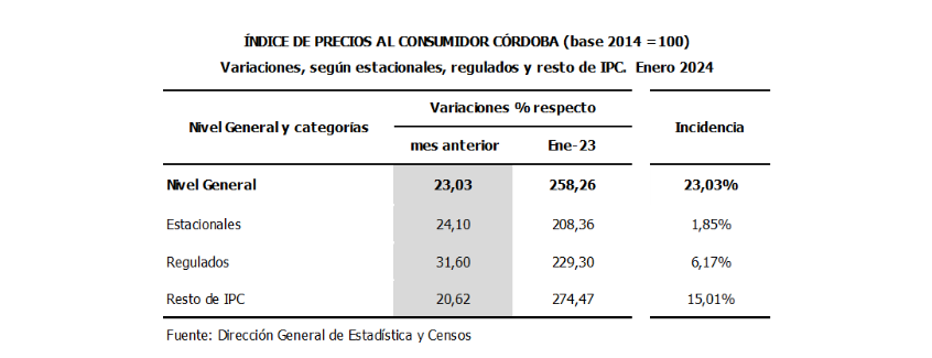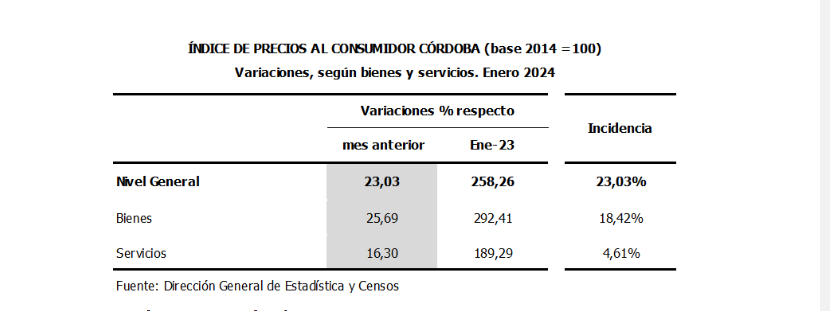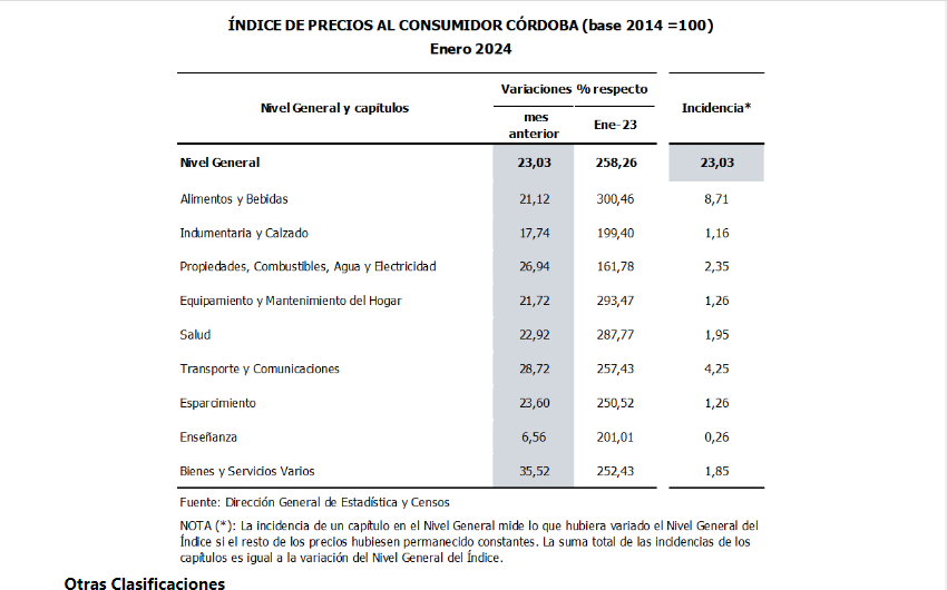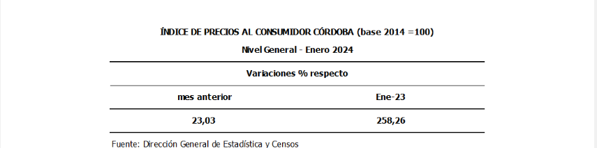Durante el mes de enero de 2024, el Índice de Precios al Consumidor Córdoba (IPC-Cba) registró un incremento en su Nivel General de 23,03% respecto al mes anterior.