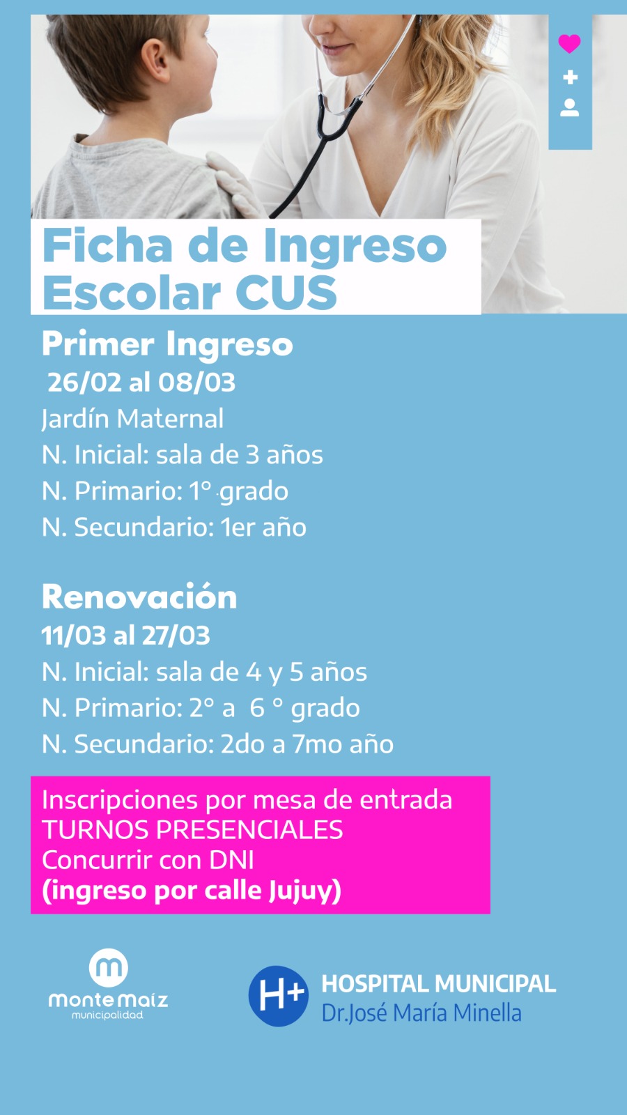 El Hospital Municipal informa que se atenderá para los Certificados de Ingreso Escolar desde el lunes 26 de febrero hasta el viernes 8 de marzo para los alumnos del primer ingreso: Jardín Maternal; Nivel Inicial: Salita de tres años; Nivel primario: 1° Grado; Nivel Secundario: 1° Año.