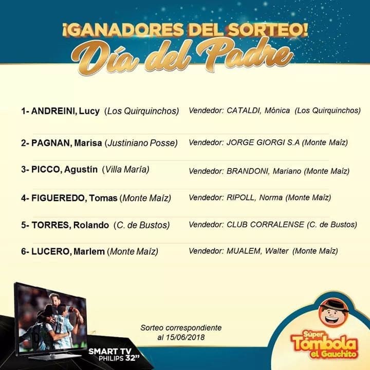 El viernes 15 de junio por la tarde la Súper Tómbola El Gauchito realizó el sorteo correspondiente al Día del Padre. En el mismo se sumaron a la lista 25 Ganadores más de nuestra localidad y de la región haciéndose acreedores de un Smart TV de 32´´ ideal para ver el Mundial de Rusia 2018. Agasajo del Día del Padre del Gauchito. En las Placas Informativas los nombres de todos los Ganadores.