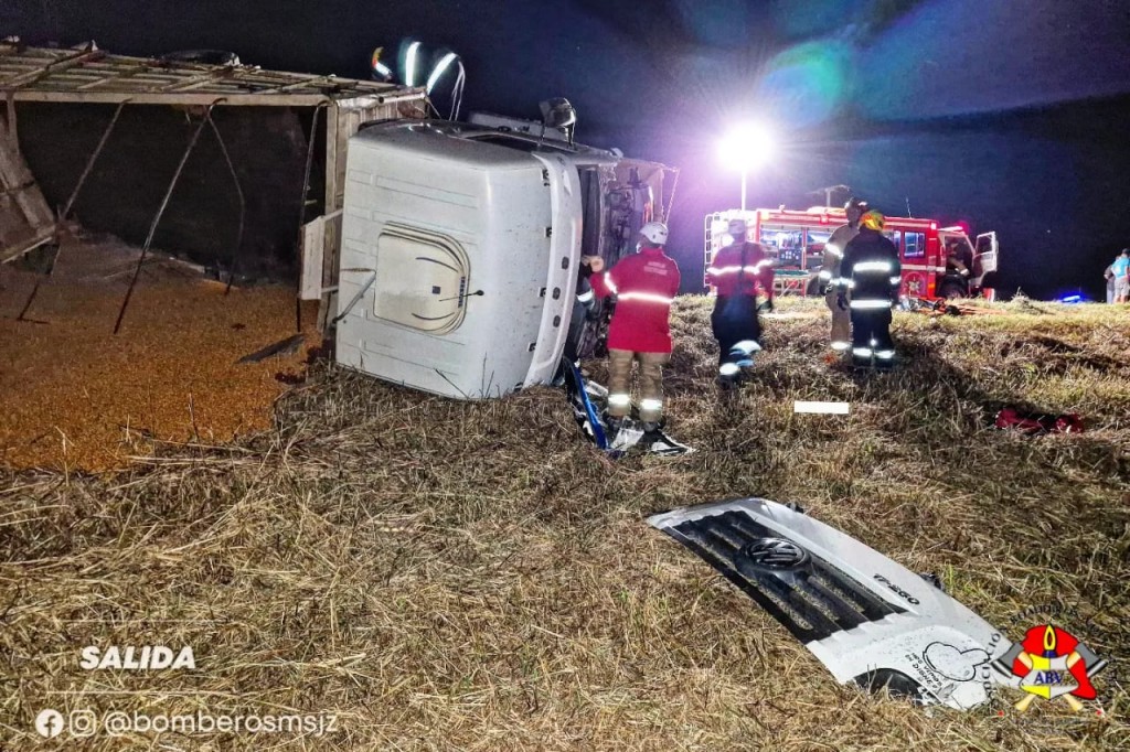 A las 20:30 horas de ayer, Bomberos Voluntarios Marcos Juárez fueron convocados por una colisión frontal entre un camión y un auto sobre Ruta 12, a unos 5 kilómetros al Sur de la ciudad de Marcos Juárez, pasando la curva de la legua, en dirección hacia Inriville.
