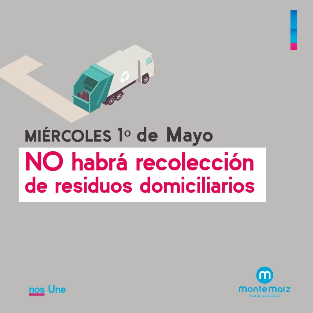 La Dirección de Obras y Servicios Públicos de la municipalidad de Monte Maíz, informa a la población, que con motivo de celebrarse el Día del Trabajador, este miércoles 1º de mayo no habrá recolección domiciliaria de residuos.
