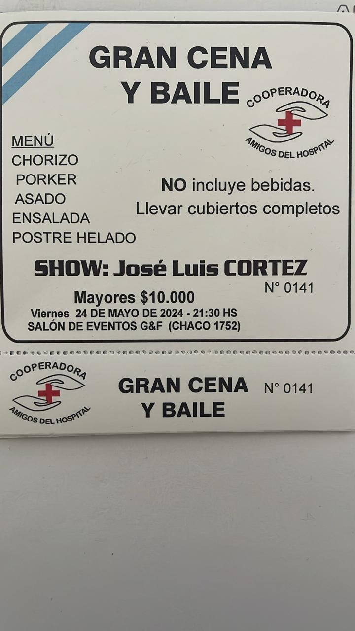 Este viernes 24 de mayo a las 21:30 hs. se llevará a cabo la tradicional cena y baile del Hospital, organizada por la Comisión Cooperadora "Amigos del Hospital". La misma tendrá lugar en el salón de eventos GyF, de calle Chaco 1752, en Bº Monterrey.
