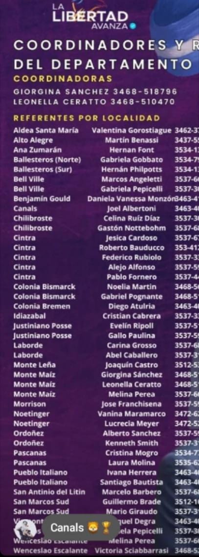 Ambas personas figuran en la lita de referentes de la Libertad Avanza de Monte Maíz, publicado por el propio Partido en sus redes sociales.