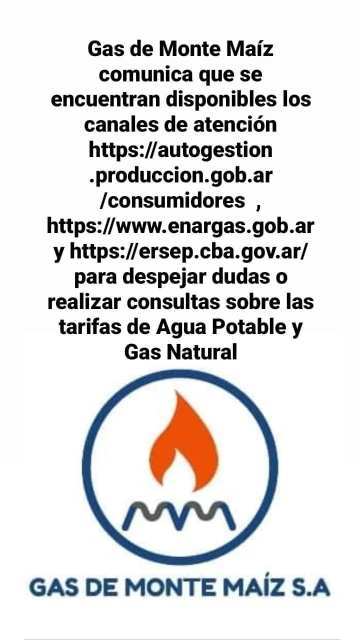 Gas de Monte Maíz comunica que se encuentran disponibles los canales de atención https://autogestion.produccion.gob.ar/consumidores , https://www.enargas.gob.ar y https://ersep.cba.gov.ar/ para despejar dudas o realizar consultas sobre las tarifas de Agua Potable y Gas Natural.