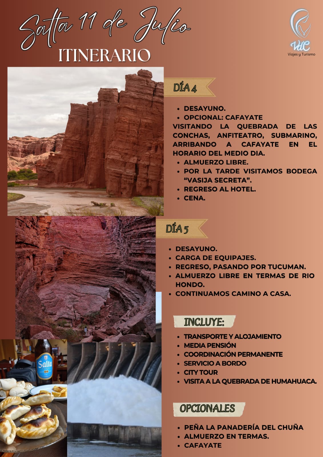 Incluye: Traslados y alojamiento media pensión; Bus Mix; servicio a bordo; coordinación permanente; visita a la Quebrada de Humahuaca y regreso por Termas de Río Hondo.