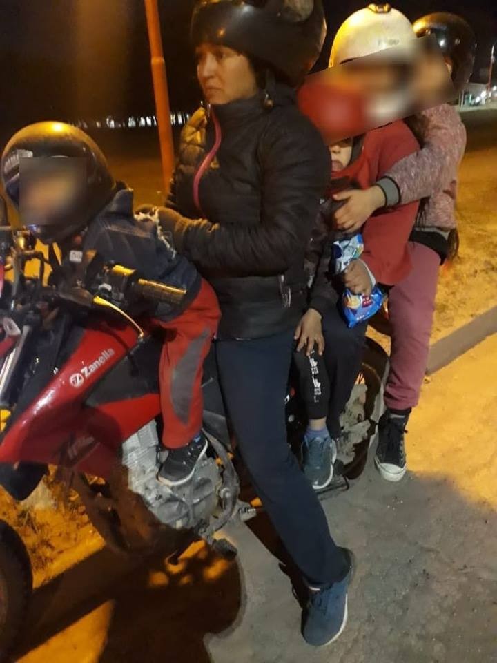 Una madre de cuatro criaturas se movilizaba en una motocicleta, Marca Zanella de 110 c.c. de color rojo, con sus cuatro hijos a bordo. El hecho ocurrió el sábado por la noche, 19:00 hs. aproximadamente, y fue advertido por Personal de Tránsito Municipal quien procedió a la detención de la conductora.
