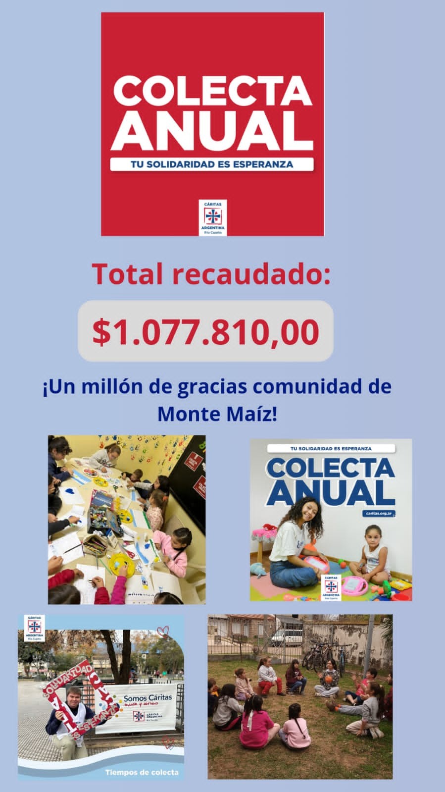 Los datos aportados por la institución local de la iglesia católica indicaron que en Monte Maíz se recaudaron $1.077.810. Los integrantes de Cáritas Parroquial agradecen inmensamente la colaboración del pueblo.