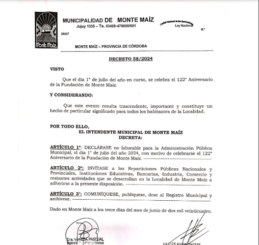MONTE MAÍZ: DECRETAN NO LABORABLE EL 1º DE JULIO