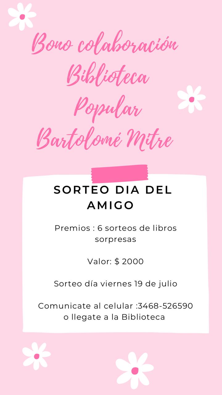Con motivo de completar la compra anual de libros, la Biblioteca Popular Bartolomé Mitre lanzó un bono colaboración de $2.000 que se puede adquirir en la misma institución o comunicándose con los teléfonos de la comisión directiva y de la Biblioteca: 3468-526590 (llamadas o mensajes de whatsapp).