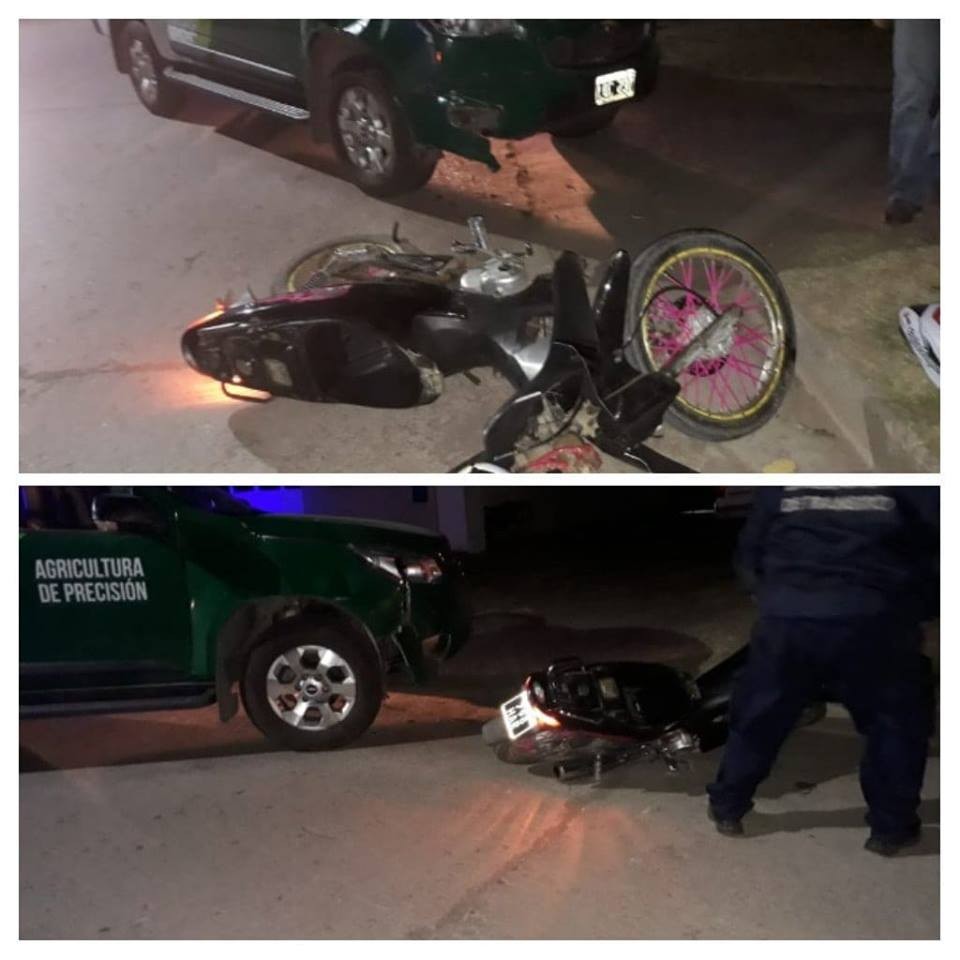Un accidente de tr�nsito entre una moto y una camioneta se produjo esta tarde, a las 19:10 hs. aproximadamente, en nuestra localidad. El mismo tuvo lugar en calle Buenos Aires, entre Chubut y� Las Malvinas de B� Gobato, cuando una camioneta Chevrolet S10, Dominio LQC 237 conducida por el Sr. Ariel Anaya de 47a�os de edad ?Titular de la empresa TIM DE Monte Ma�z- , se aprestaba a ingresar a una cochera sobre calle Buenos Aires con circulaci�n de Este a Oeste. En sentido contrario circulaba una motocicleta Motomel Biz de 110 c.c., Dominio 798 HAR, guiada por Leonel Far�as Giaccone, de 22 a�os de edad tambi�n de Monte Ma�z, quien no advirti� la luz de giro de la camioneta y termin� impactando contra la misma. El conductor del rodado menor cay� al piso como consecuencia del impacto y en el lugar fue asistido por Personal de Bomberos Voluntarios de nuestra localidad y luego fue trasladado al Hospital Municipal ya que presentaba un golpe en una pierna. Los veh�culos fueron retenidos y alojados en dependencia Policial de manera preventiva.