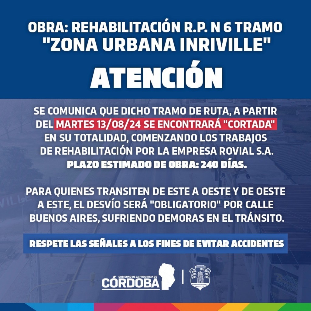 Queremos informarles sobre una situación importante para quienes transiten por nuestra localidad. A partir del 13 de agosto y por 240 días, el tramo urbano de la Ruta 6 (Inriville) estará cerrado al tránsito. El desvío se realizará por la calle Buenos Aires.