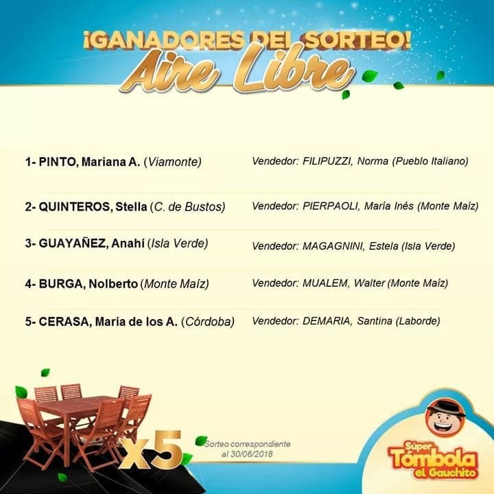 El sábado 30 de junio por la tarde se llevó a cabo un nuevo sorteo mensual de la Súper Tómbola El Gauchito. Conocé a los ganadores de 5 juegos de Camping; 10 Carpas y 10 Kits de Camping.