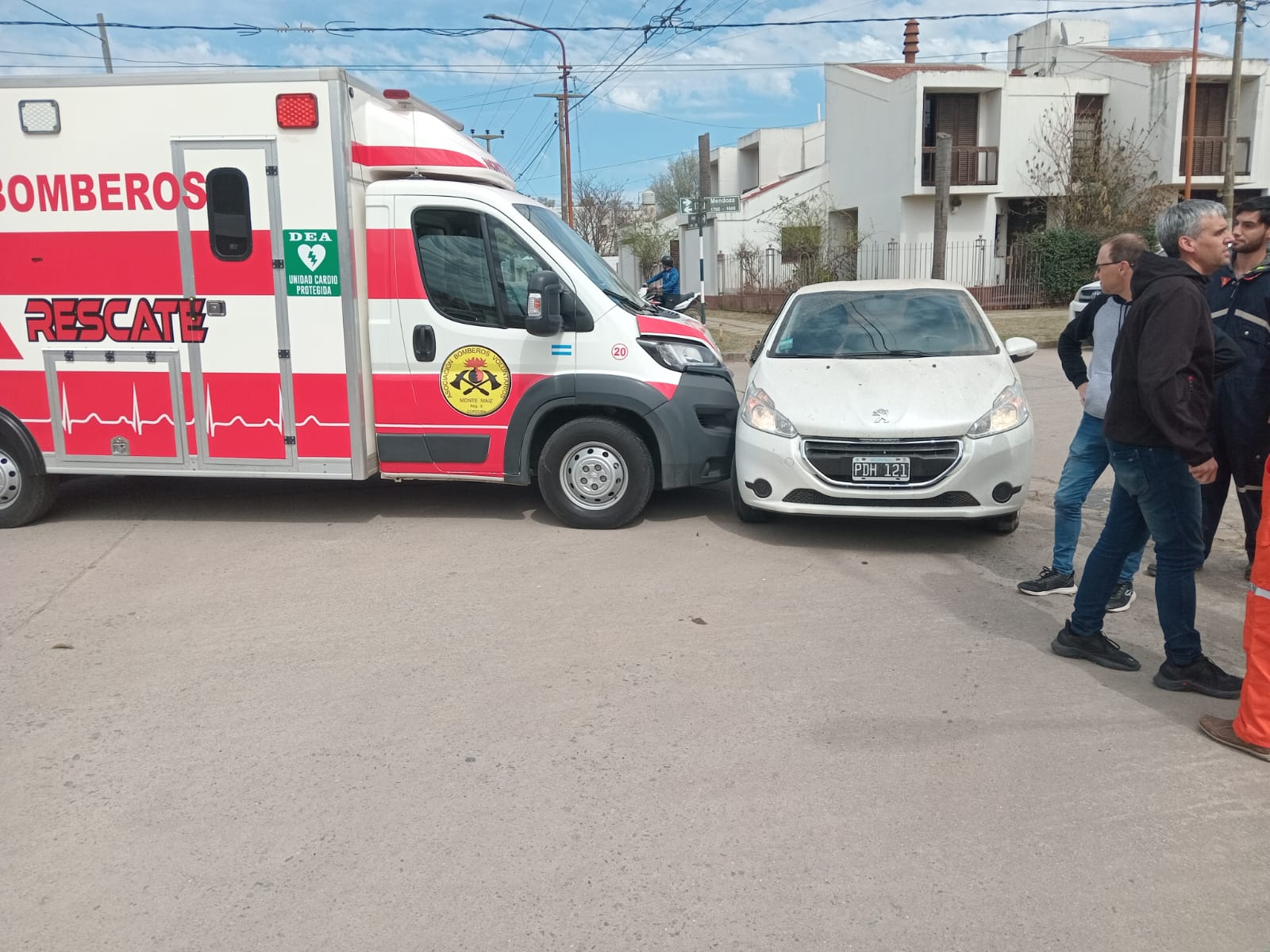 En el lugar, la ambulancia de Bomberos Voluntarios de Monte Maíz colisionó con un automóvil Peugeot 208, dominio PDH 121 de color blanco, conducido por Aylén Bonifay, comiciliada en calle San Juan de nuestra localidad.