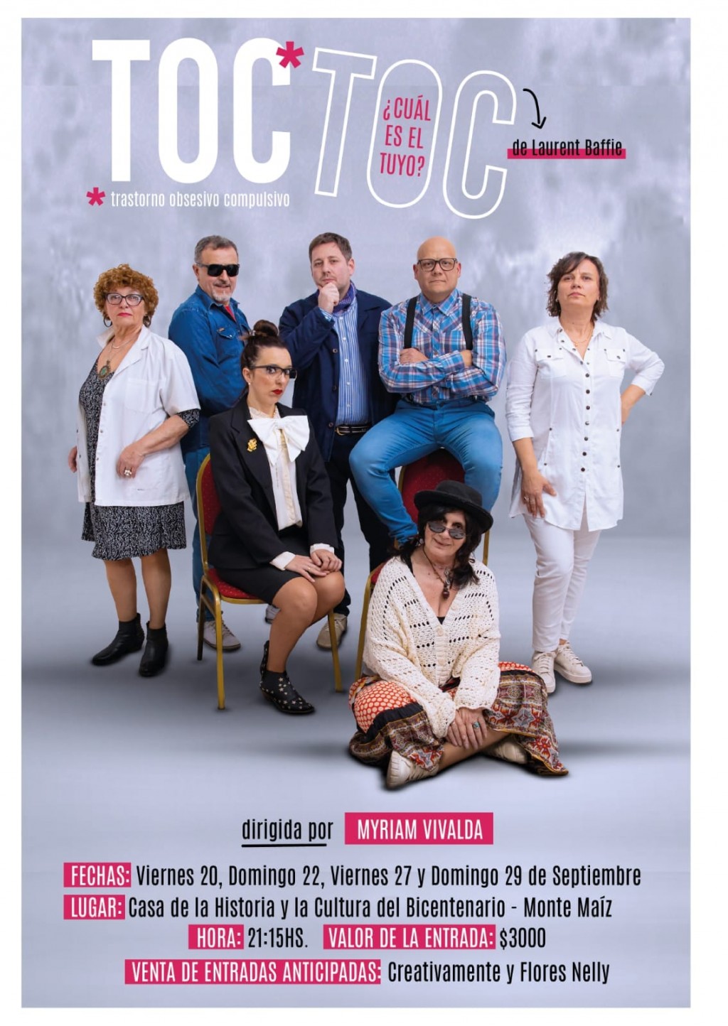 Durante dos fines de semanas consecutivos, viernes 20, domingo 22; viernes 27 y domingo 29 de setiembre; se presentará la obra de teatro "Toc Toc ¿Cuál es el tuyo?", dirigida por Mirian Vivalda.