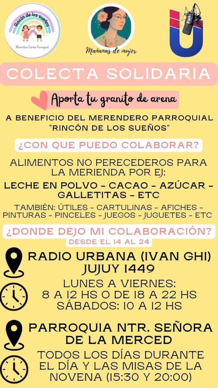Desde el Programa "Mañanas de Mujer", que conduce Verina Diano, en Urbana FM, se lanzó una colecta solidaria para el merendero parroquial "Rincón de los Niños".