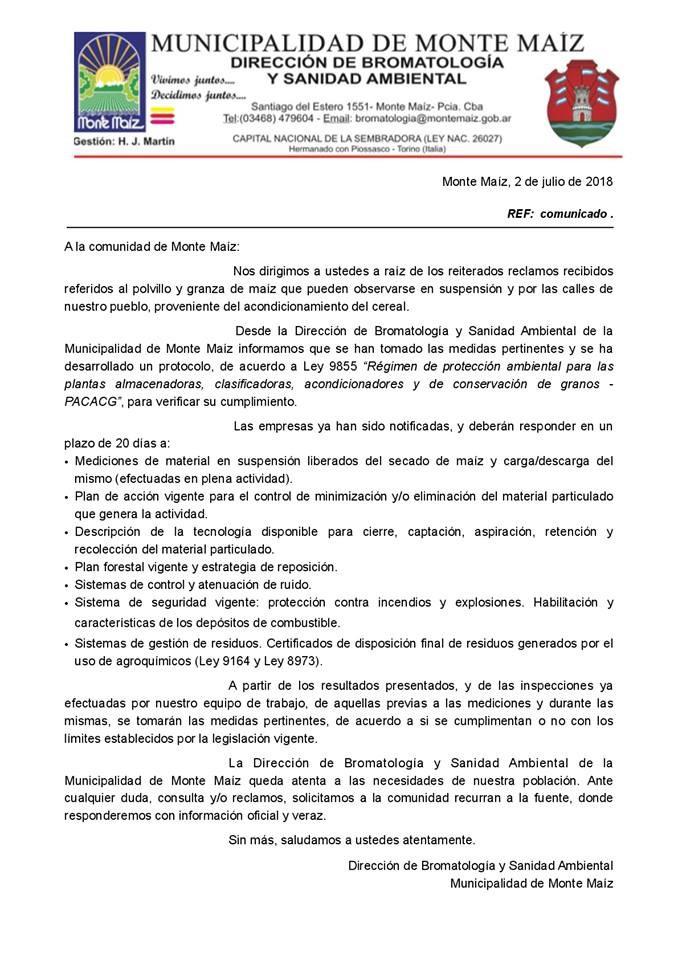 A través del mismo quiere llevar tranquilidad a los vecinos de nuestro pueblo informando que ya se han hecho las inspecciones pertinentes y que, además, se ha desarrollado un Protocolo, de acuerdo a la Ley 9855 “Régimen de Protección Ambiental para las Plantas Almacenadoras, Clasificadoras, Acondicionadores y de Conservación de Granos PACACG”, para verificar su cumplimiento.