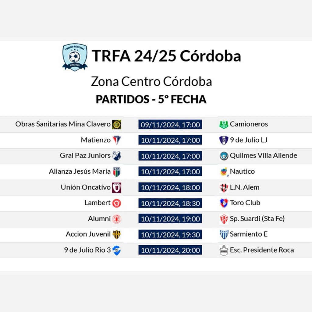 El único encuentro que se juega antes es el de Obras Sanitarias de Mina Clavero vs Camioneros, el Sábado 11.