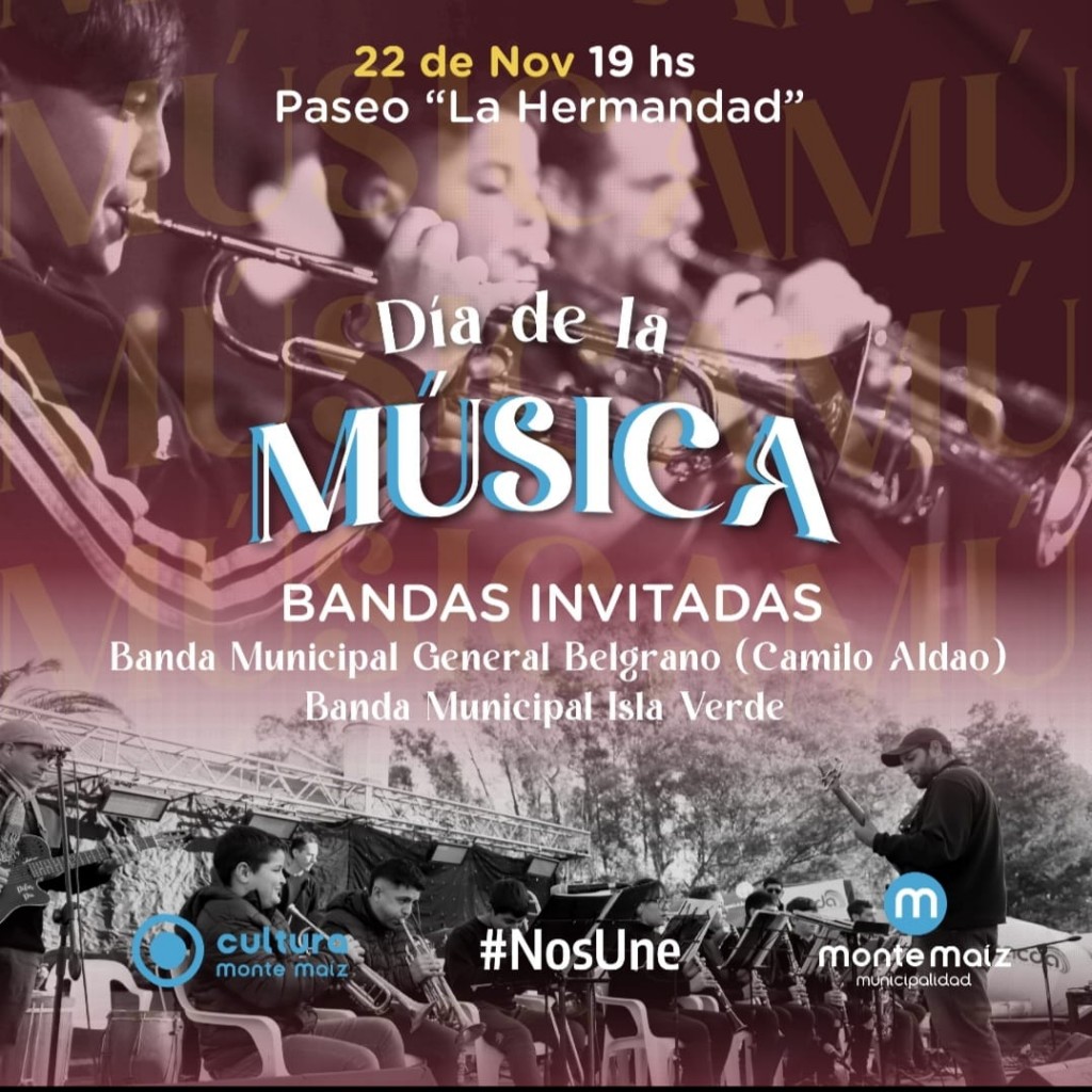 En la oportunidad se desarrollará un concierto de Bandas municipales, del cual participarán: la escuela de música y banda municipal de Monte Maíz, la escuela de música Manuel Belgrano de Camilo Aldea y la la banda municipal de la localidad de Isla Verde.