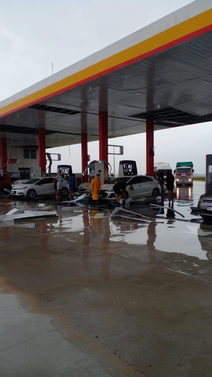 Una estación de servicio Shell, inaugurada hace pocos días sufrió los embates del viento. Volaron siilas, motos estacionadas y hubo importantes daños materiales en el lugar. Afortunadamente no hubo que lamentar personas heridas.