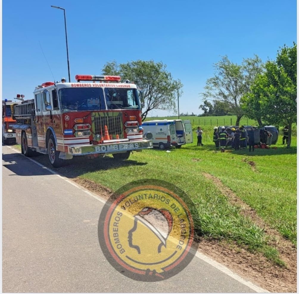 Se comisionaron 2 Dotaciones con Autobombas de Rescate, a los fines de asistir, rescatar y acondicionar para su traslado a dos ocupantes que se conducían en una camioneta que protagonizó un vuelco en solitario, siendo ambos trasladados en la Ambulancia del Dispensario de W. Escalante al Hospital de Laborde. Finalizadas las tareas requeridas en el lugar, se regresa al Cuartel.