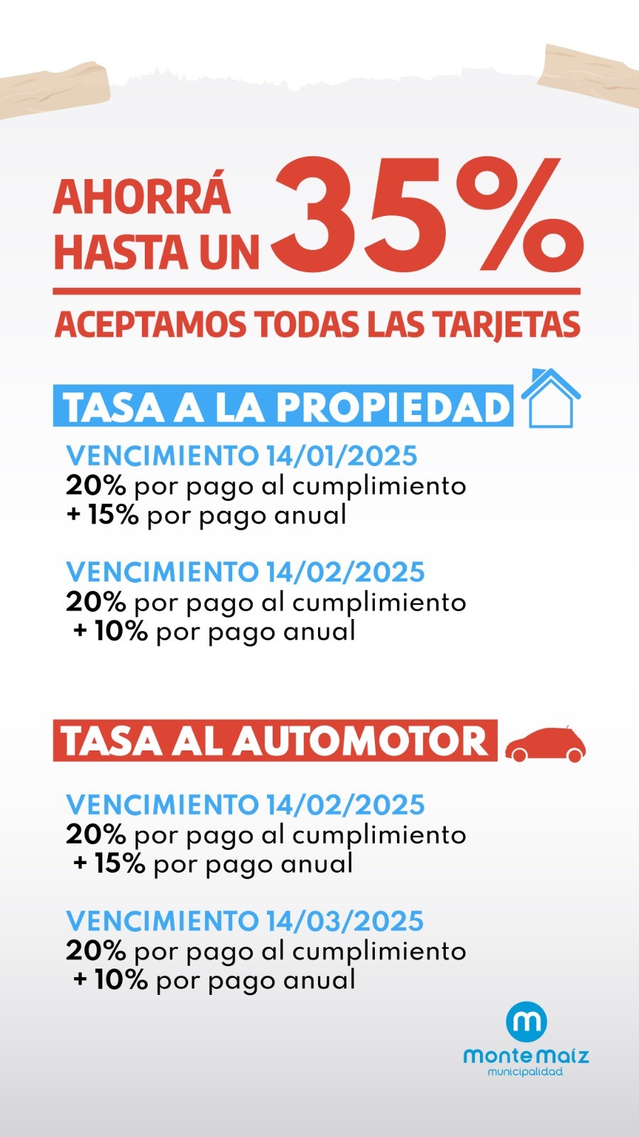 Desde la Secretaría de Hacienda y Finanzas de la municipalidad de Monte Maíz se recuerda al vecino que hay importantes descuentos por Pago Único de la Tasa a la propiedad y del impuesto al automotor. Ambos tributos tienen dos vencimientos; el primero alcanza hasta un 35% de descuentoM mientras que el segundo llega al 30% de descuento.