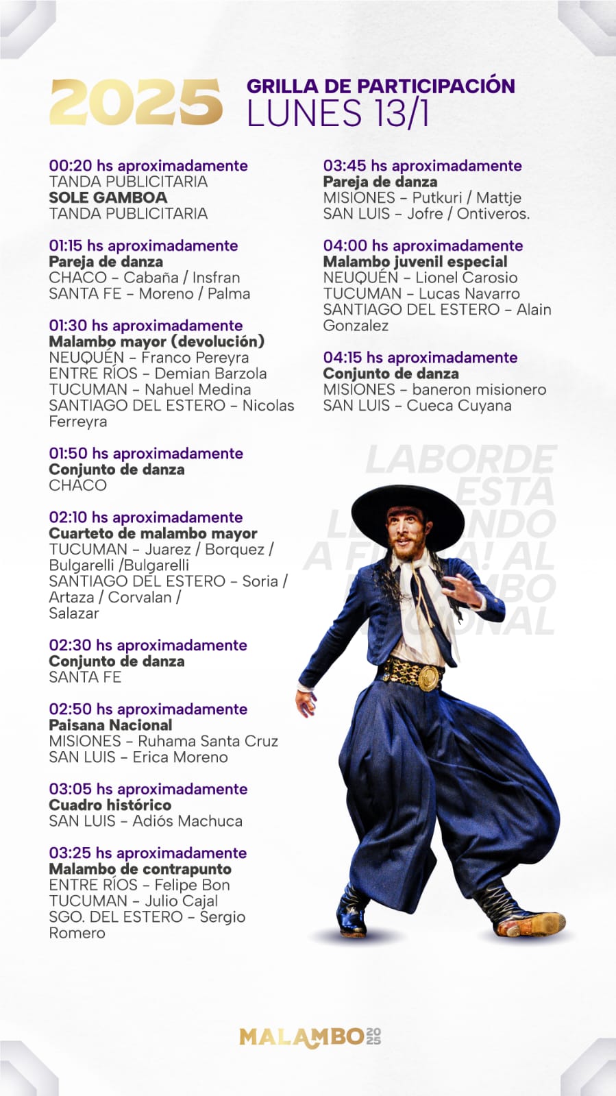 - 23:50 Malambo Mayor, compiten hoy: Franco Pereyra (Neuquén); Demian Barzola (Entre Ríos); Nahuel Medican (Tucumán); Nicolás Ferreyra (Santiago del Estero).