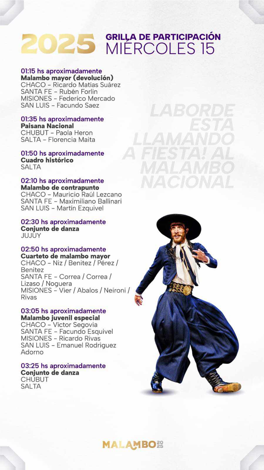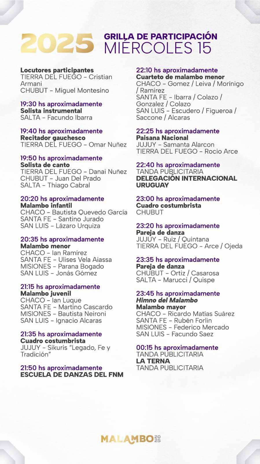 - 23:45 será el turno del Malambo Mayor, hoy compiten: Ricardo Matías Suárez (Chaco); Rubén Forlín (Santa Fe); Federico Mercado (Misiones); Facundo Saez (San Luis).