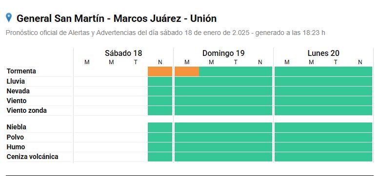 El área será afectada por tormentas fuertes o severas. Las mismas estarán acompañadas principalmente por ráfagas que podrían superar los 90 km/h, caída de granizo, fuerte actividad eléctrica y abundante caída de agua en cortos períodos. Se prevén valores de precipitación acumulada entre 40 y 80 mm, pudiendo ser superados en forma puntual.