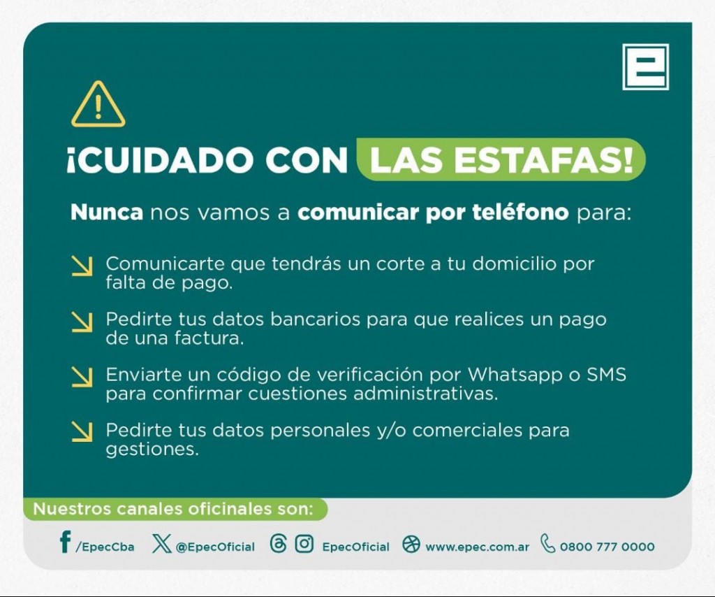 Se reitera que desde EPEC no se realizan llamados telefónicos para: