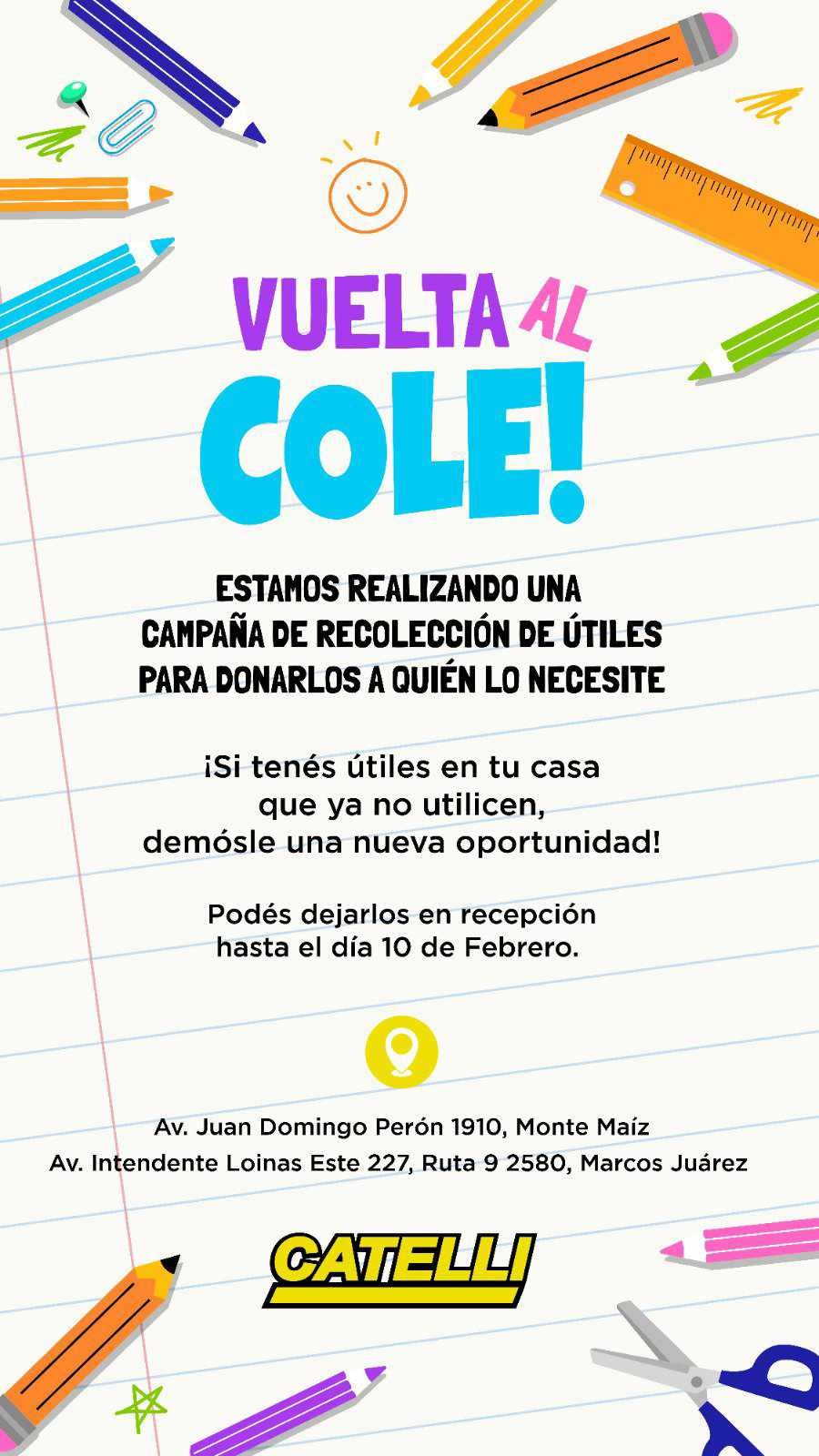 Un nuevo compromiso social se tomó la empresa Catelli S.A. y esta vez tiene que ver con la colecta solidaria de útiles escolares, que serán repartidos en un merendero de Marcos Juárez y en el Instituto del Divino Niño Jesús de nuestra localidad.