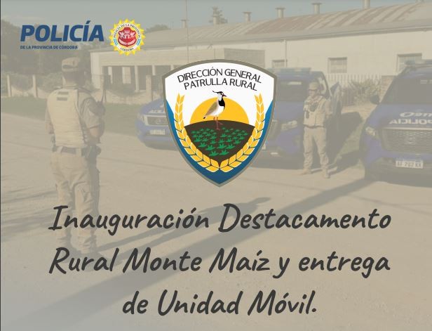 Es por esto que el Ministerio de Bioagroindustria de la Provincia de Córdoba, dará por inaugurado el Destacamento de Patrulla Rural Monte Maíz.