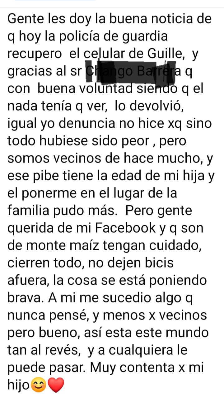 En la mañana de este sábado, dijo también en sus redes sociales, que la policía de guardia había recurado el teléfono de su hijo, pese a no haber denunciado el hecho. Agradeció el accionar policialy pidió a los vecinos del puebo que tomen precauciones ante, lo que ella entiende, sería una situación "brava" la que estamos viviendo.