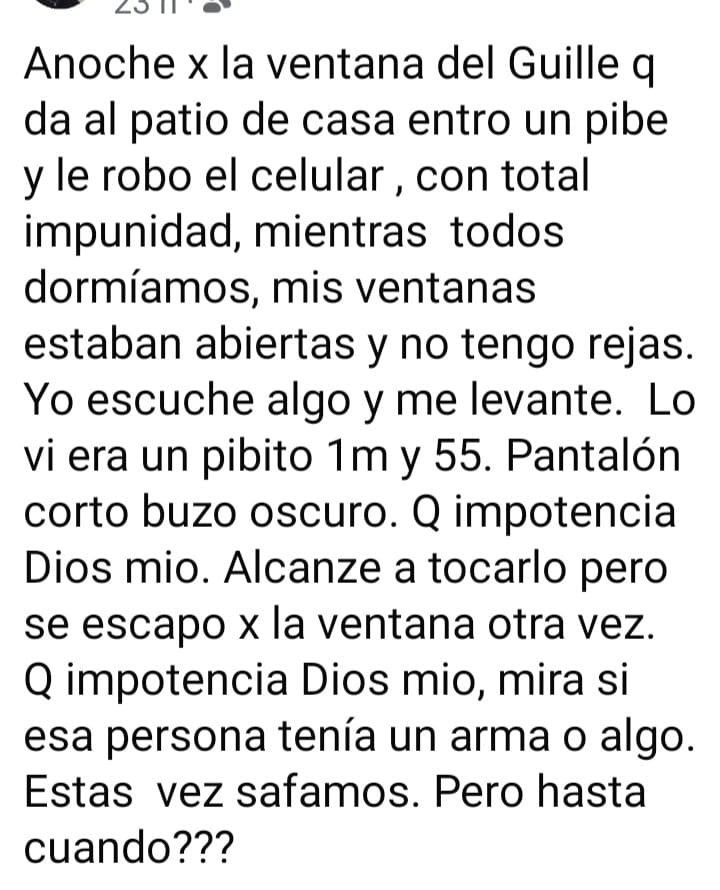 Según relató vía Facebook: "La ventana estaba abierta y yo no tengo rejas. Escuché ruidos, me levanté, fui a la pieza de mi hijo, lo ví al chico, como de 1,55 mts. de estatura, intenté detenerlo pero se me escapó. Salió por la ventana y huyó con el celular de mi hijo".