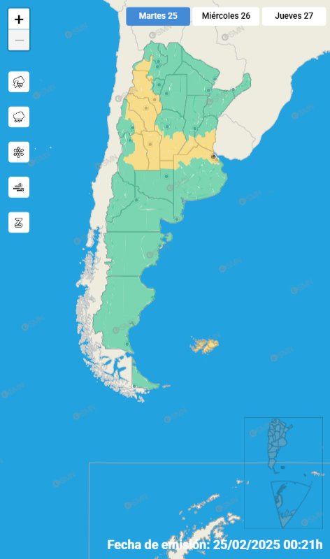 El área será afectada por tormentas aisladas, algunas localmente fuertes. Las mismas estarán acompañadas por abundante caída de agua en cortos períodos, fuerte actividad eléctrica, ocasional caída granizo y ráfagas que podrían alcanzar los 90 km/h. Se prevén valores de precipitación acumulada entre 30 y 60 mms, pudiendo ser superados en forma puntual.