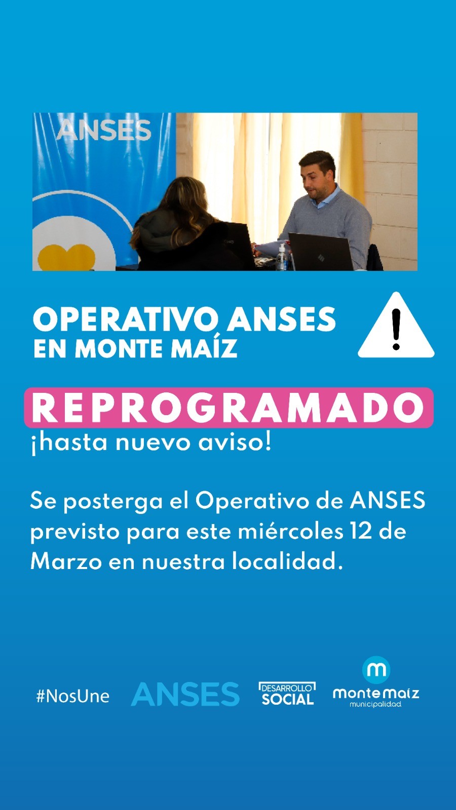 La Secretaría de Desarrollo Social de la Municipalidad de Monte Maíz informa que se posterga el Operativo de ANSES previsto para este miércoles 12 de marzo en nuestra localidad.