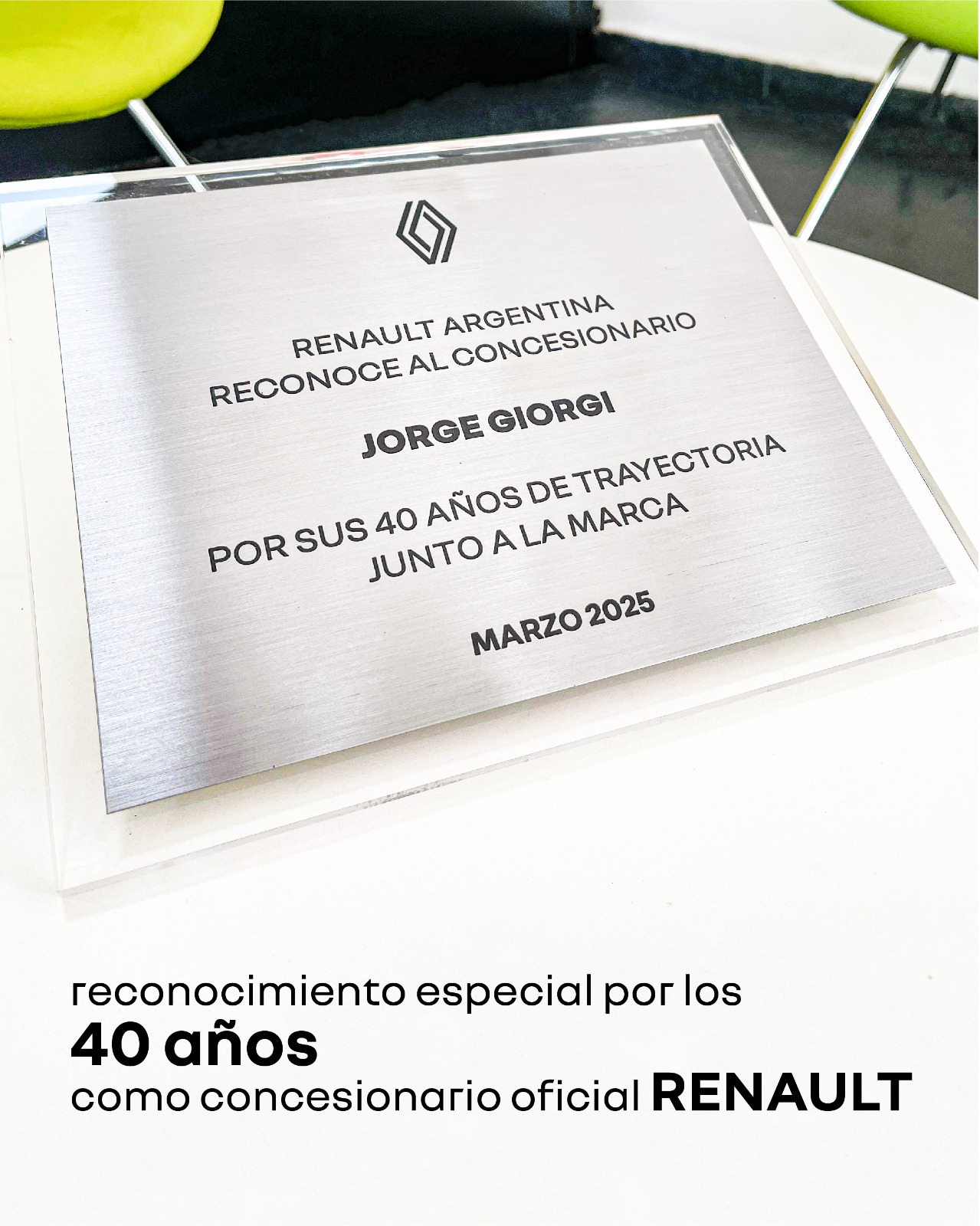 Grande fue la sorpresa cuando dentro de las menciones, más precisamente en el final, como broche de oro de las mismas, Pablo Sibillas, CEO y Presidente de Renault Argentina, no solo entregó el "Rombo de Oro", sino también una placa por la trayectoria del empresario local con la Marca. Ya que, más allá de hacer 48 años que comercializa Renault, el Concesionario oficial cumplió 40 años.