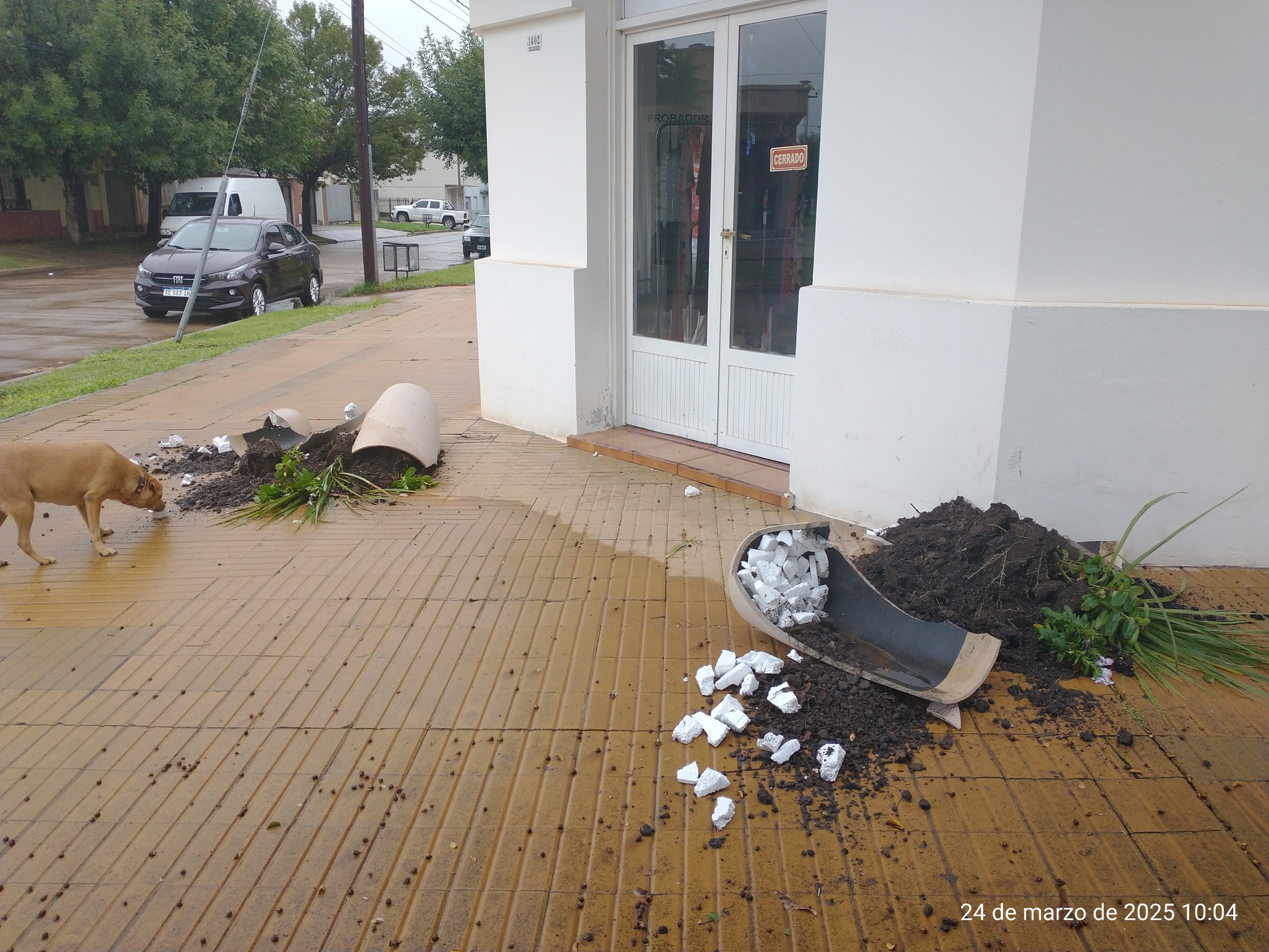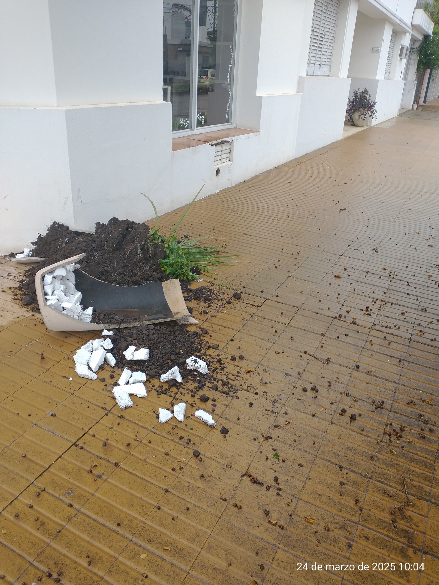 Dos grandes macetas que estaban a ambos lados de la puerta fueron destruidas de manera intencional por autor/es ignorados.