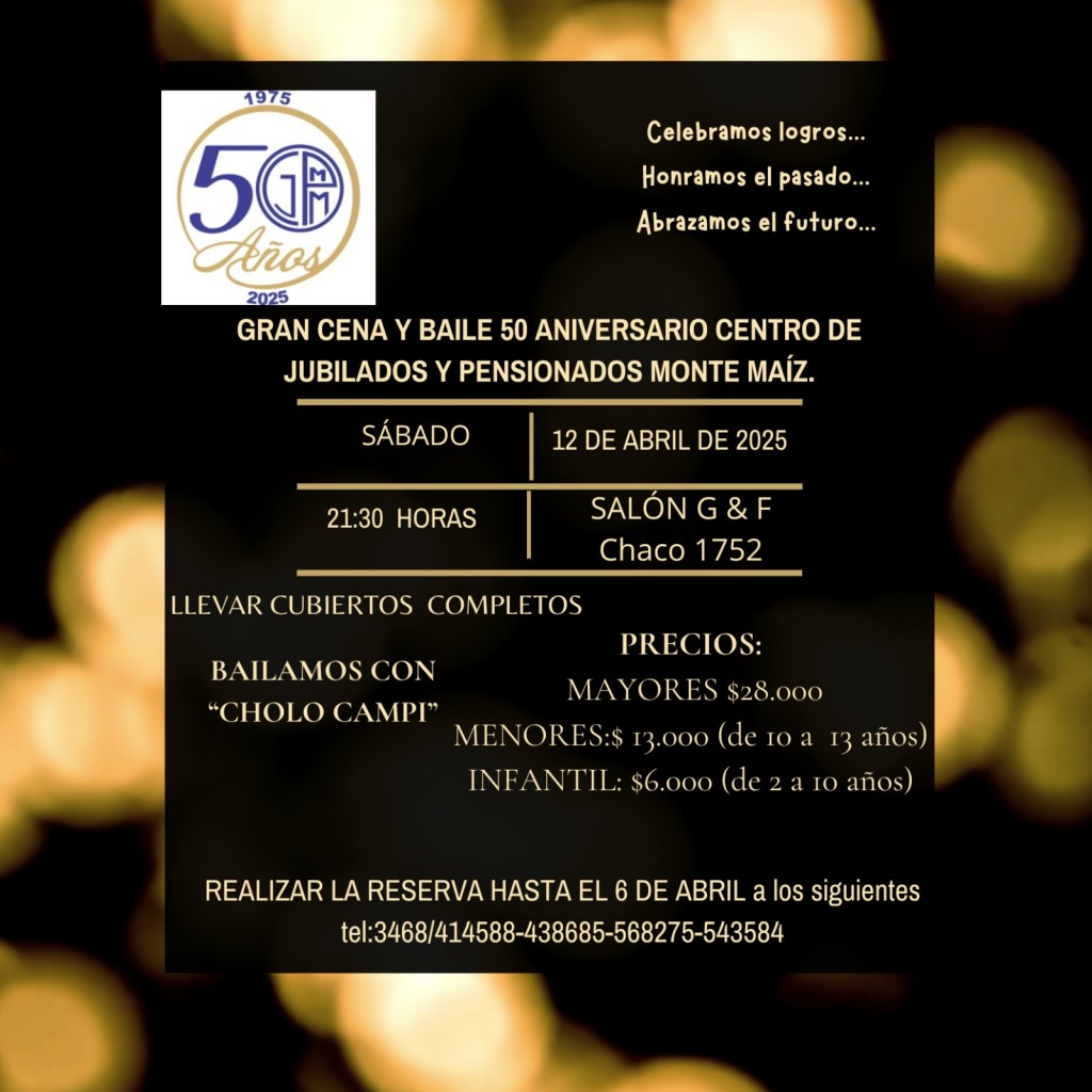El Centro de Jubilados y Pensionados de Monte Maíz cumple sus Bodas de Oro y prepara una gran Cena y Baile para el día sábado 12 de abril en el Salón de Eventos G y F de Bº Monterrey.