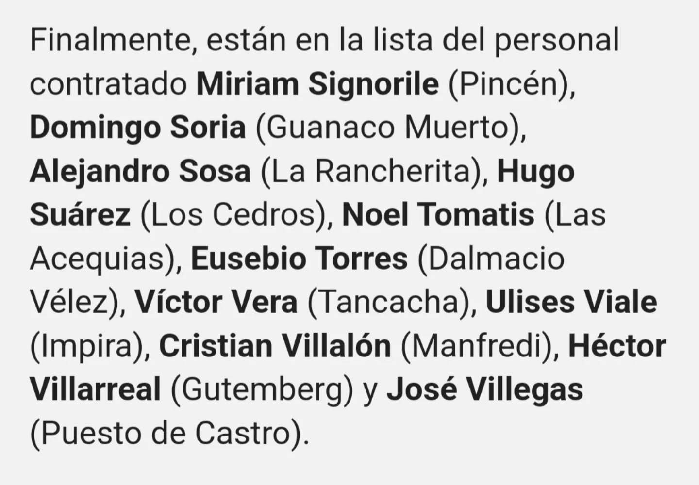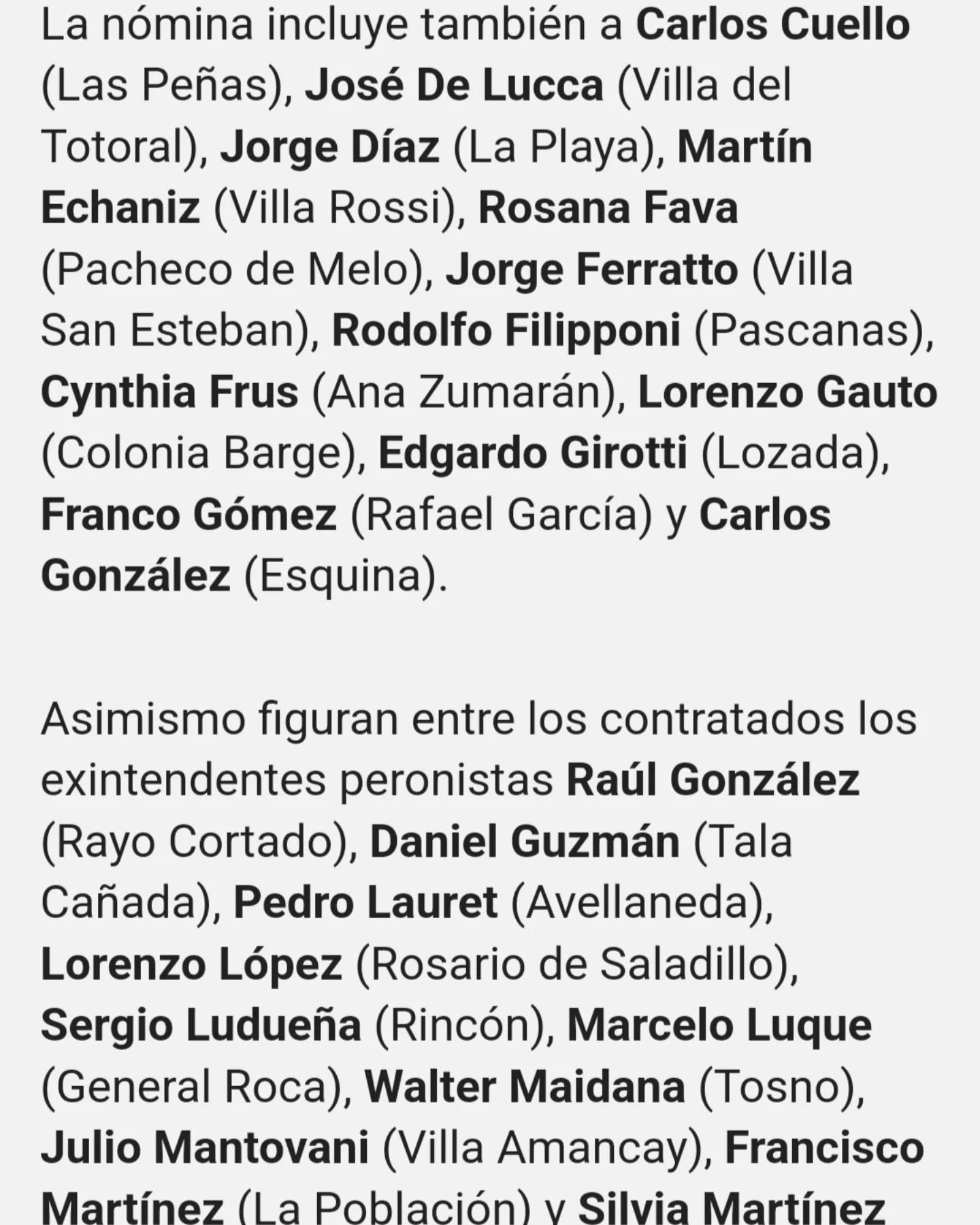 Asimismo figuran entre los contratados los exintendentes peronistas Raúl González (Rayo Cortado), Daniel Guzmán (Tala Cañada), Pedro Lauret (Avellaneda), Lorenzo López (Rosario de Saladillo), Sergio Ludueña (Rincón), Marcelo Luque (General Roca), Walter Maidana (Tosno).