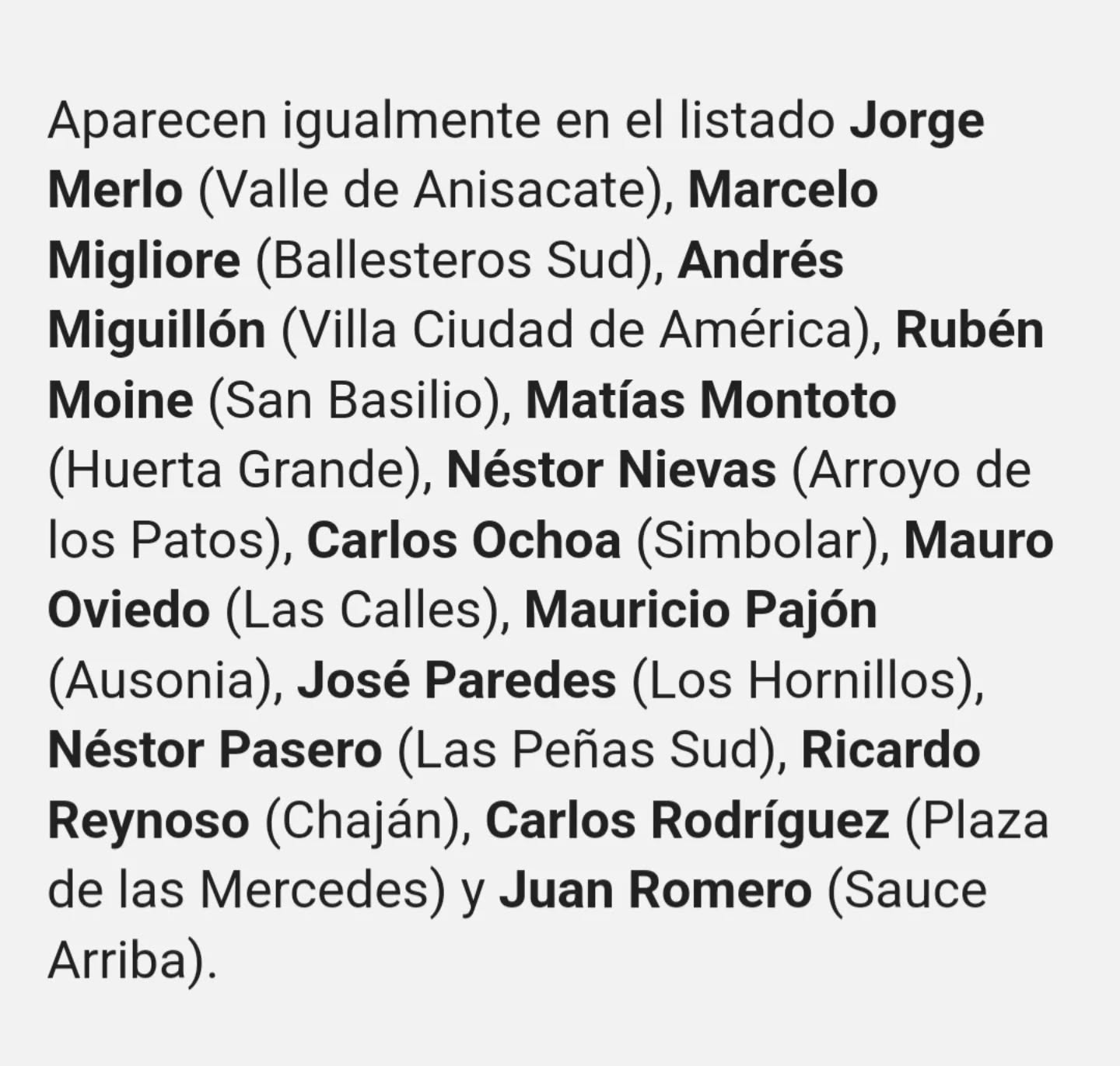 La lista sigue con Carlos Benítez (Huanchilla), Carola Bertotti (El Rastreador), Víctor Blengino (Colonia San Pedro), César Briguera (San Marcos Sierras), Gustavo Bustos (Chañar Viejo), Carlos Calvo (Los Cisnes), Jorge Carbelo (Media Naranja), Edgardo Castro (Cañada de Río Pinto), Miguel Cerutti (Riobamba) y Claudio Chavero (Santa Rosa de Calamuchita).