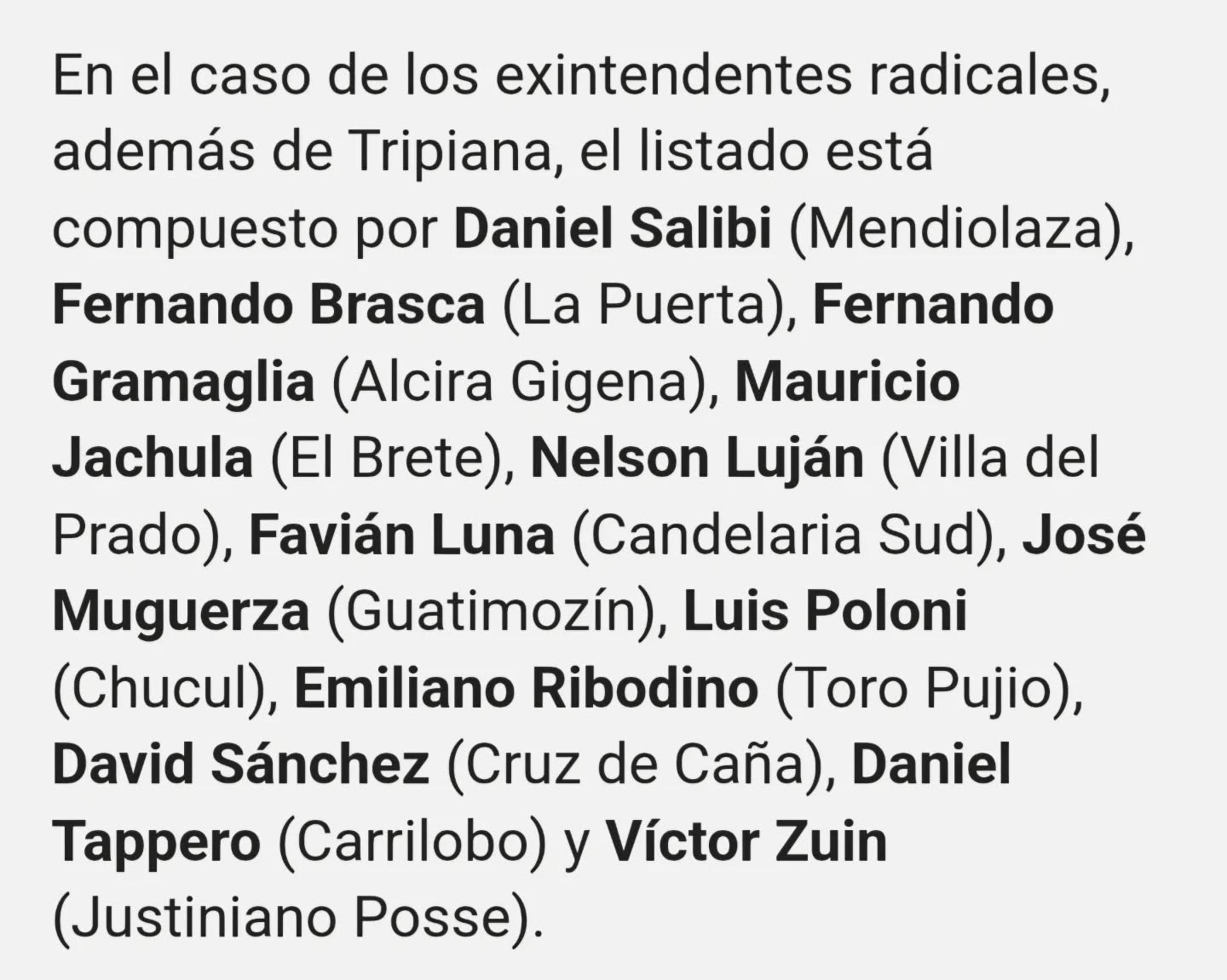 En el caso de los exintendentes radicales, además de Tripiana, el listado está compuesto por Daniel Salibi (Mendiolaza), Fernando Brasca (La Puerta), Fernando Gramaglia (Alcira Gigena), Mauricio Jachula (El Brete), Nelson Luján (Villa del Prado), Favián Luna (Candelaria Sud), José Muguerza (Guatimozín), Luis Poloni (Chucul), Emiliano Ribodino (Toro Pujio), David Sánchez (Cruz de Caña), Daniel Tappero (Carrilobo) y Víctor Zuin (Justiniano Posse).