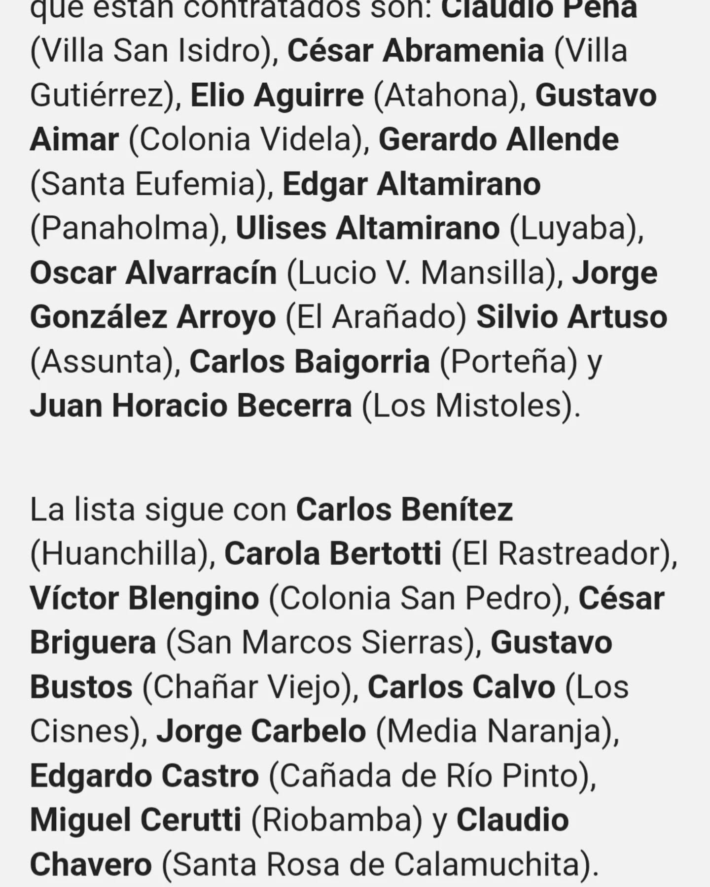 La nómina incluye también a Carlos Cuello (Las Peñas), José De Lucca (Villa del Totoral), Jorge Díaz (La Playa), Martín Echaniz (Villa Rossi), Rosana Fava (Pacheco de Melo), Jorge Ferratto (Villa San Esteban), Rodolfo Filipponi (Pascanas), Cynthia Frus (Ana Zumarán), Lorenzo Gauto (Colonia Barge), Edgardo Girotti (Lozada), Franco Gómez (Rafael García) y Carlos González (Esquina).