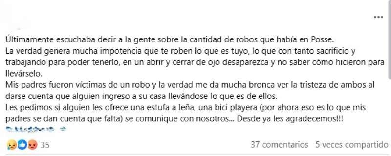 JUSTINIANO POSSE: INDIGNACIÓN POR ROBO DOMICILIARIO