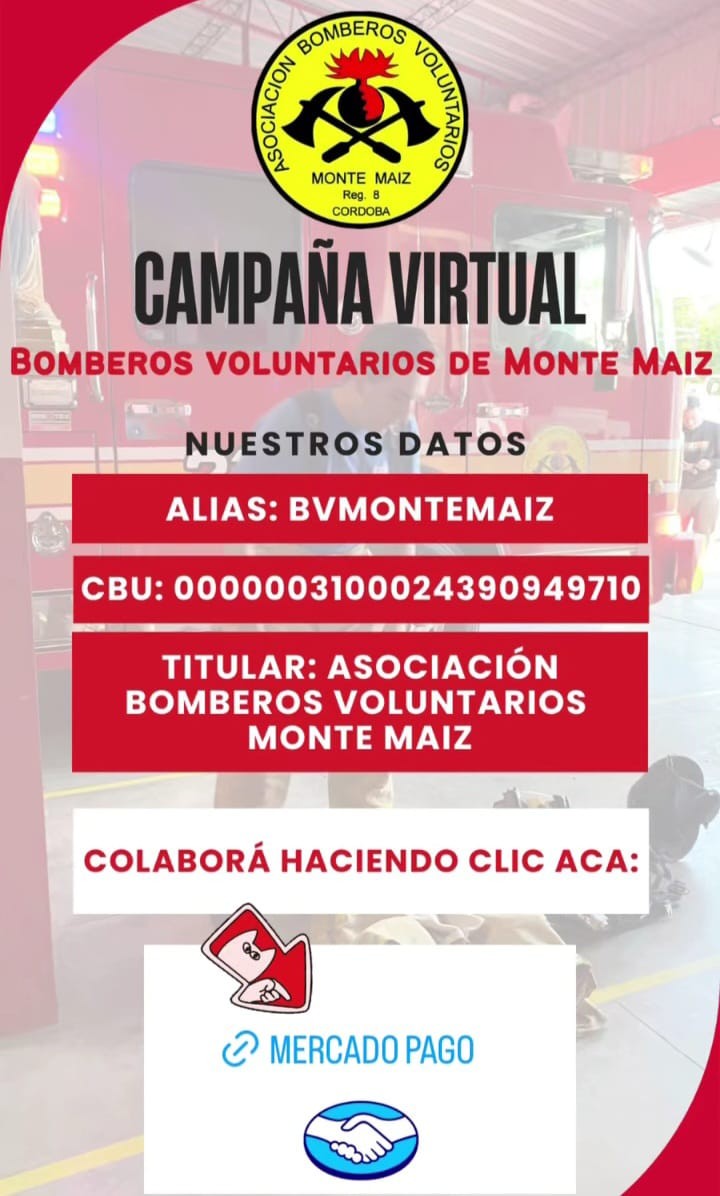 Quien pueda colaborar puede hacerlo mediante transferencia al Alias: BVMONTEMAIZ o al CBU: 0000003100024390949710. Tituladr de la cuenta: Asociación Bomberos Voluntarios de Monte Maíz.