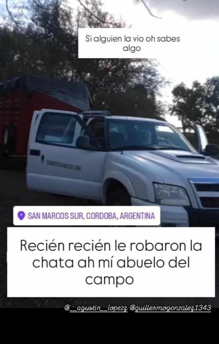 Elvio "el Negro" López, el damnificado, dialogó con la periodista Sabrina Ruoredda, de la mencionada localidad y le contó lo sucedido: "El miércoles estuve en el campo hasta las 18:45 hs. aproximadamente. Me crucé al campo de un vecino que le compré un horno a gas, y en ese rato me robaron. Yo la vi pasar a la camioneta pero pensé que erami nieto. Y se han llevado varias cosas; soldaduras, taladro, amoladora, dos motosierras; dinero que tenía en mi casa; ropa de veterano de guerra y una bandera. Un poco de todo me llevaron. Yo la pasé al lado a la camioneta pero no le vi la cara al que manejaba. Para mí iba con otro vehículo porque en la caja no llevaba nada. Cruzó el puente y agarró para el lado de Marcos Juárez por autopista. En Leones la vieron, andaba por el Centro hasta que agarró por camino de tierra hasta Tortugas. Yo enseguida hice la denuncia. Me llevaron escopetas también. Revolvieron todo. En cosa de media hora hicieron un desastre. Nos han estado espiando para mí porque siempre queda alguien en la casa. Justo el miércoles no había nadie".